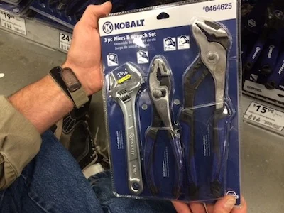 4. Channellocks. When he shows me these I am confused. I always thought these were called pliers. Or wrenches. Turns out I’m right. HM informs me that “Channellocks” and “Crescent wrench” are brand names like Kleenex, and are terms that HMs use interchangeably with "pliers" and "adjustable wrench." (Other terms they toss around for these tools include LINESMAN, NEEDLE NOSE, DIKES (OR DYKES), VICE, etc.) HM is cheating a bit in this category. Probably to make up for having to put the hammer on the list. He wants you to buy a cheap multi pack of assorted wrenches and pliers. Estimated cost: $18-25.